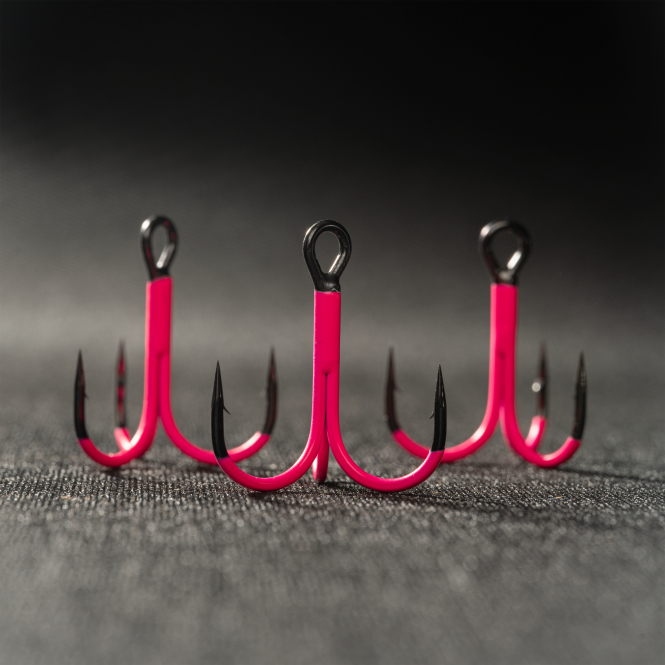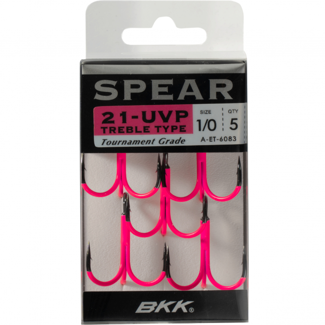 Der BKK Spear-21 UVP ist ein Spezial-Drilling mit pinker UV-Beschichtung, die bei UV-Licht einen starken Kontrast und ein auffälliges Glühen erzeugt. Besonders unter trüben Bedingungen oder bei wenig Licht verbessert die UV-Farbe die Sichtbarkeit des Köders und kann entscheidende Bisse auslösen, wenn andere Drillinge unbemerkt bleiben.