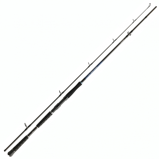 - Mit einem HMC+ Kohlefaserblank mit X-Wicklung geteiltem EVA-Griff und Seaguide Ringe
