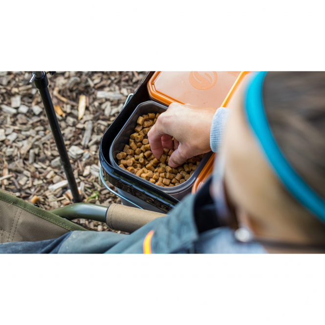 Mit einem Fassungsvermögen von 17 Litern und vier separat einsetzbaren Behältern ermöglicht es, unterschiedliche Köder oder Futtermischungen getrennt vorzubereiten und erst direkt am Wasser nach Bedarf zu kombinieren. Die einzelnen Behälter lassen sich platzsparend stapeln und ermöglichen durch ihre seitlichen 0,25-Liter-Markierungen ein genaues Portionieren. Gefrierschranktauglich.