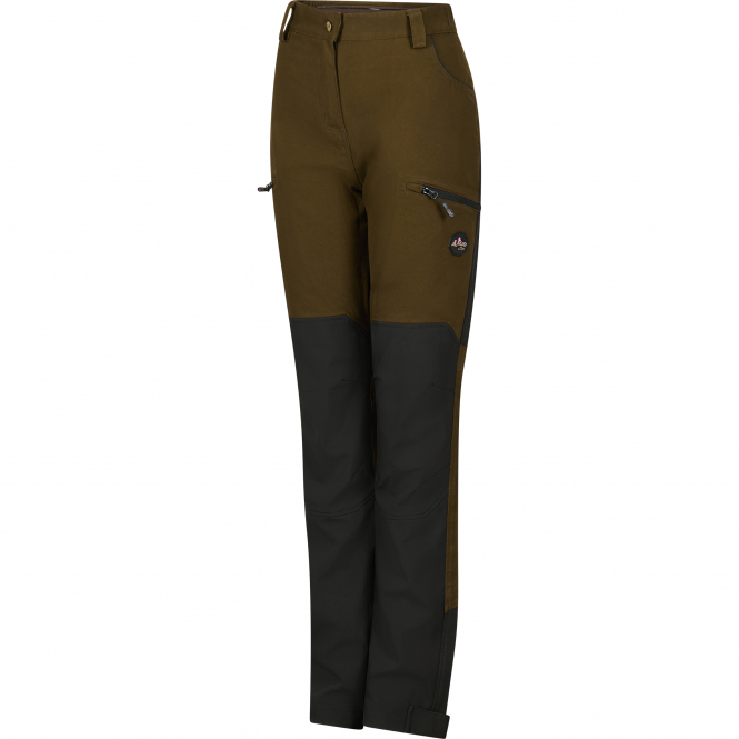 Diese Damen-Jagdhose vereint Komfort, Funktionalität und Langlebigkeit und ist damit ideal für anspruchsvolle Jagdeinsätze. Das robuste Canvas-Gewebe mit hohem Stretch-Anteil sorgt für optimale Bewegungsfreiheit und einen angenehmen Sitz. An besonders beanspruchten Stellen ist die Hose mit schwarzem Membran-Kontrastmaterial verstärkt, das zusätzlichen Schutz bietet und zuverlässig wasserdicht ist.