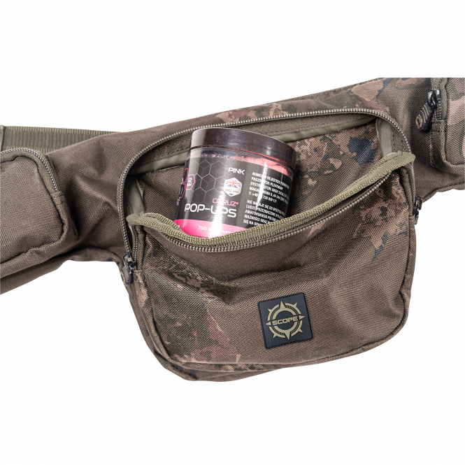 Vier externe Reißverschlusstaschen nehmen Tackle, Köder und Zubehör auf, während eine elastische Außenschlaufe eine Futterschleuder griffbereit hält. Der verstellbare Schultergurt ermöglicht bequemes Tragen über der Schulter oder – dank Schnallen an beiden Enden – auch um die Hüfte. Über D-Clips lässt sich die Rod Skin an jedes Scope Rod Skin System befestigen und bildet so eine sofort einsatzbereite Kombination, ideal für die Oberflächenangelei.