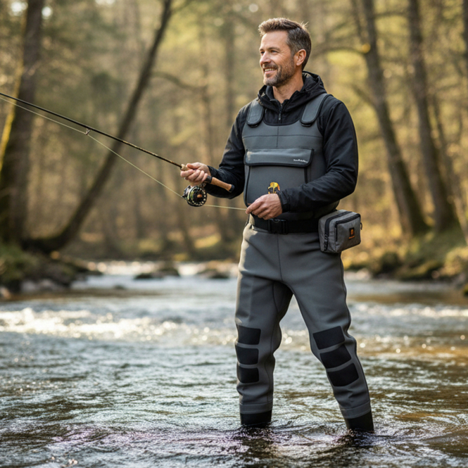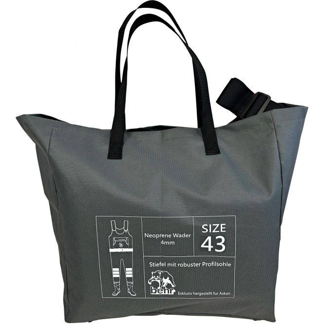 Material Wathose: 90 % Neopren, 10 % Nylon. Material Tasche: 100 % Polyester.