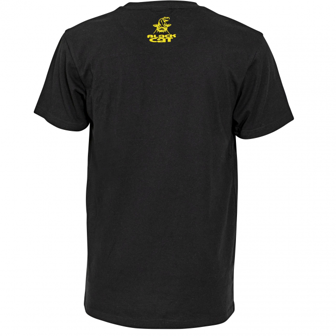 Luftig und angenehm zu tragendes Unisex Shirt. Mit Rundhalsausschnitt und gelbem Black Cat Print auf der Brust. Farbe: schwarz.