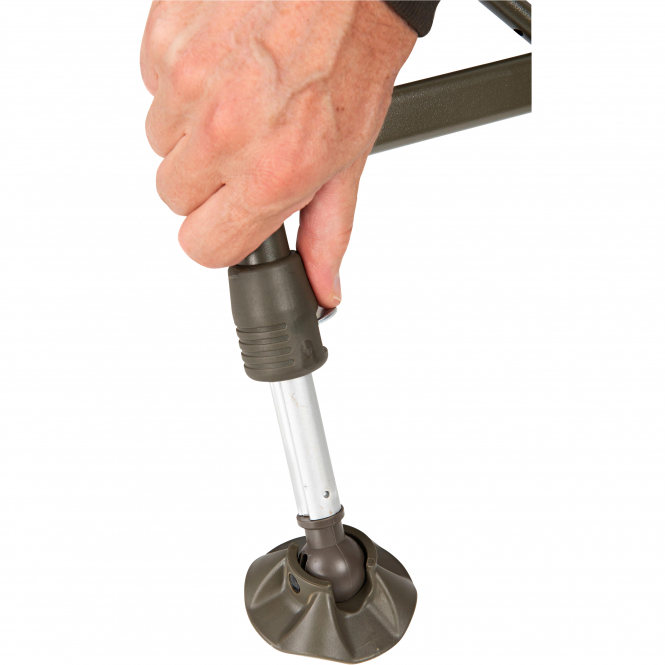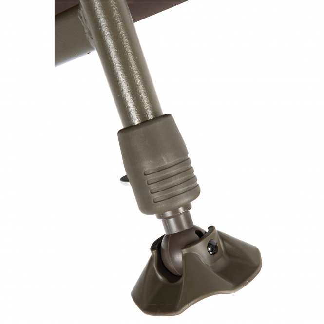 Sechs höhenverstellbare Beine ermöglichen eine optimale Anpassung an unterschiedliche Untergründe, während Kugelgelenk-Schlammfüße für sicheren Stand sorgen. Ein integriertes Spanngurtsystem erlaubt das kompakte Zusammenklappen – auch mit aufgelegtem Schlafsack – und erleichtert so Transport und Lagerung erheblich.