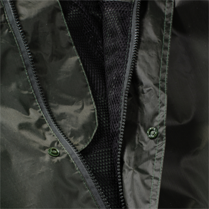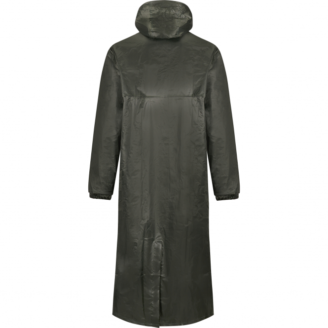Wasserdichter Regenmantel mit verdecktem 2-Wege-Reißverschluss, heißverschweißten und wasserdichten Nähten, verstellbarer Kapuze, elastischen Sturmbündchen in den Ärmelenden und großem Ventilationsschlitz am Rücken. Außentaschen sind gegen das Eindringen von Wasser geschützt. Farbe: oliv.