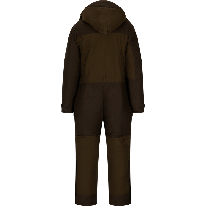 Die Kapuze des Anzugs ist abnehmbar und kann in Weite und Volumen reguliert werden. Sie ist zudem mit einem auffälligen orangefarbenen Warnkragen versehen, der für zusätzliche Sicherheit sorgt. An den Beinenden befinden sich Reißverschlüsse und knöpfbare Blenden, die das Anziehen von Stiefeln erleichtern und für zusätzlichen Komfort sorgen.