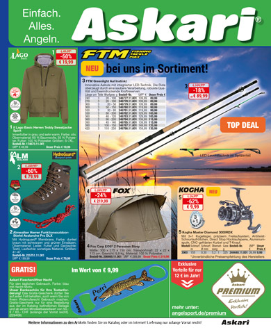 Auf über 640 Seiten finden Sie eine breite Vielfalt an Angelruten, Angelrollen und Angelzubehör zu fantastischen Preisen! Neben dem umfangreichen Angel-Sortiment bieten wir Ihnen auch eine riesen Auswahl an Outdoor-Bekleidung und Camping-Zubehör.