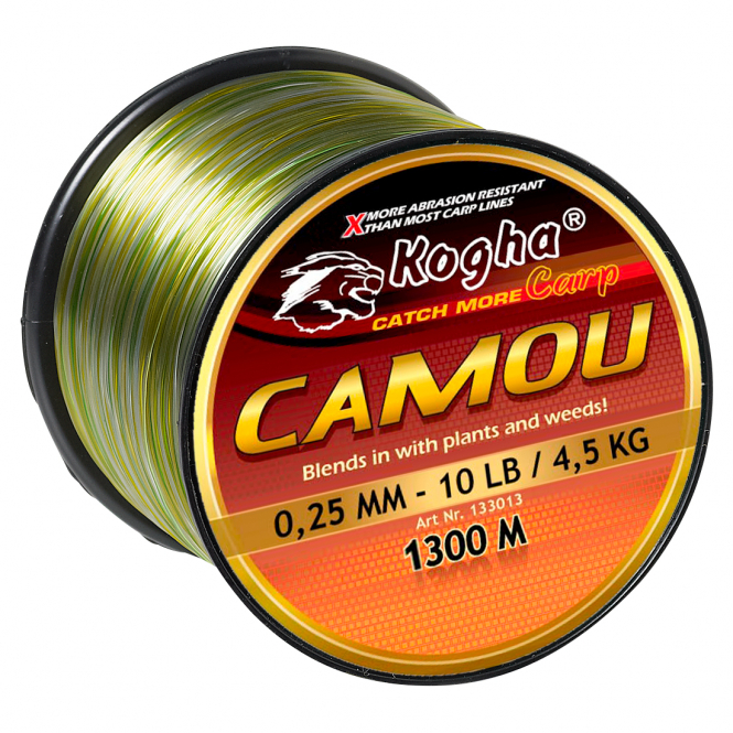 Monofile Hochleistungs-Karpfenschnur im Camou-Look. Die Kogha Carp Camou-Schnur ist nahezu unsichtbar unter Wasser. Hervorragende Abriebsfestigkeit und ein optimales Dehnverhalten.