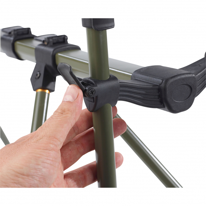 Lässt sich kompakt oder als großes Highpod nutzen. Maße: Länge 80–120 cm, Höhe 50–100 cm (einseitig bis 120 cm). Leichte, robuste Aluminiumkonstruktion, Päzisions-Schnellverschlüsse, höhenverstellbare Rutenauflagen, inkl. 3× V- und 3× U-Rutenauflagen, Nylon-Transporttasche.