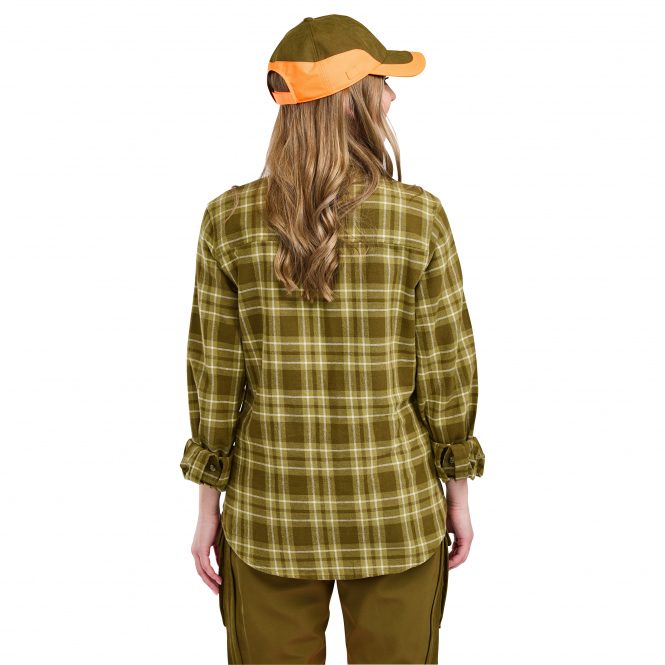 Feminin trifft auf Flanell! Elegant und feminin geschnittene Bluse aus gebürstetem weichen Baumwoll-Flanell, in der man sich wohl fühlt. Ideal zu tragen im Gelände oder auf Reisen. Ausgestattet mit 2 dezente Brusttaschen mit RV und hochkrempelbare Ärmel.