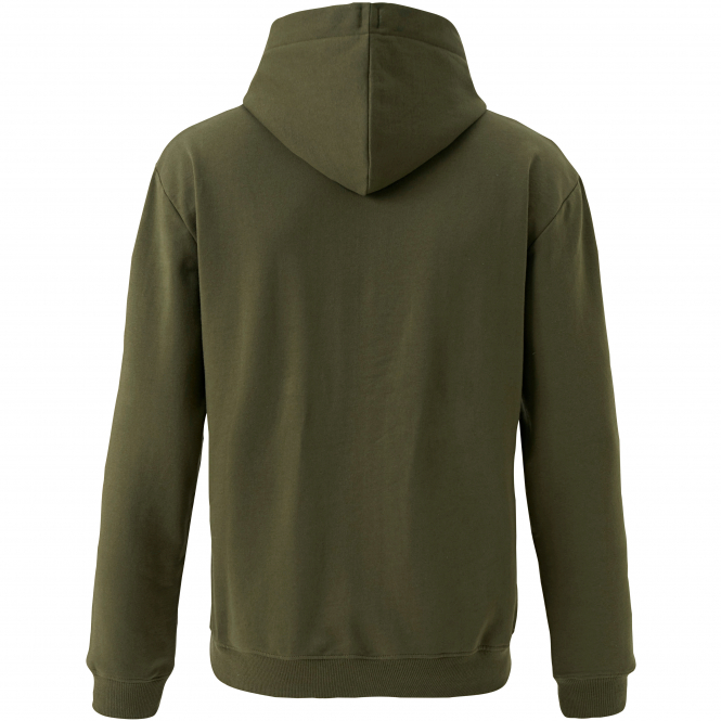 Ein weicher Kapuzen-Sweater mit großer Fronttasche und Bündchen an den Ärmeln und Saum. Kapuze kann mit Kordelzug verstellt werden. Farbe: dunkel oliv.