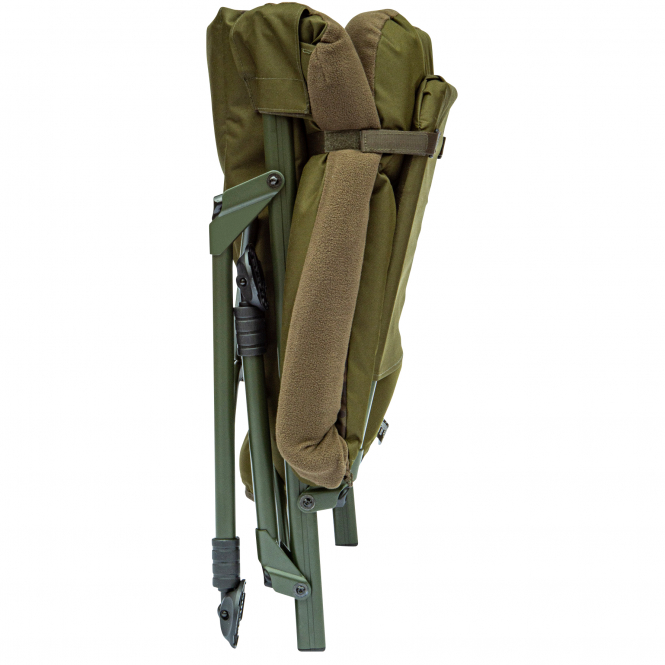 Das Gestell ist aus demselben hochfesten Aluminium gefertigt wie bei den bekannten Bettstühlen und Stühlen von Solar Tackle. Außerdem verfügt er über die Befestigungsmethode, die diese Stühle so berühmt gemacht hat, denn sie verhindert das Durchhängen und hält große Gewichte aus. Sowohl die vorderen als auch die hinteren Klappbeine sind mit Sicherungsclips ausgestattet, damit der Stuhl bei seitlicher Bewegung nicht zusammenbricht. Die Spring-Loc-Beinverstellung ermöglicht eine mühelose Einstellung, natürlich mit schwenkbaren Füßen.