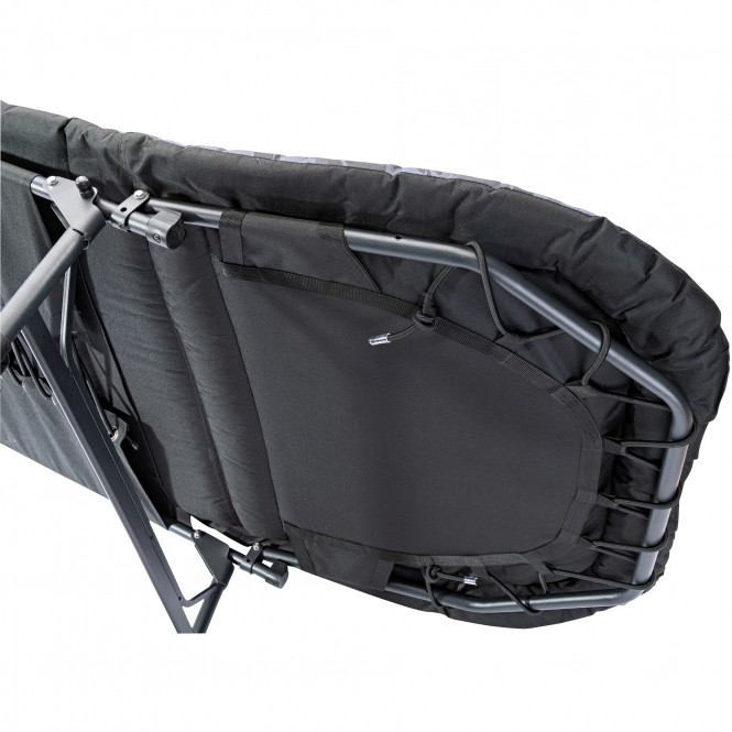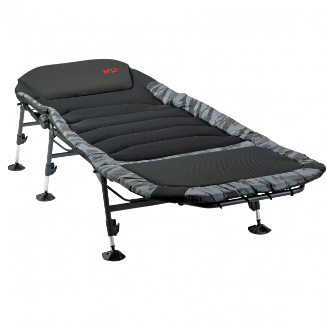 Die Liegehöhe lässt sich über eine Push-Button-Verstellung flexibel anpassen und wird zusätzlich durch einen Einrastmechanismus gesichert. Mit einer großzügigen Liegefläche bietet der Bed Chair viel Platz und Stabilität, bleibt dabei aber noch gut transportabel. Das dezente, moderne Design fügt sich unauffällig in jedes Angelsetup ein.
